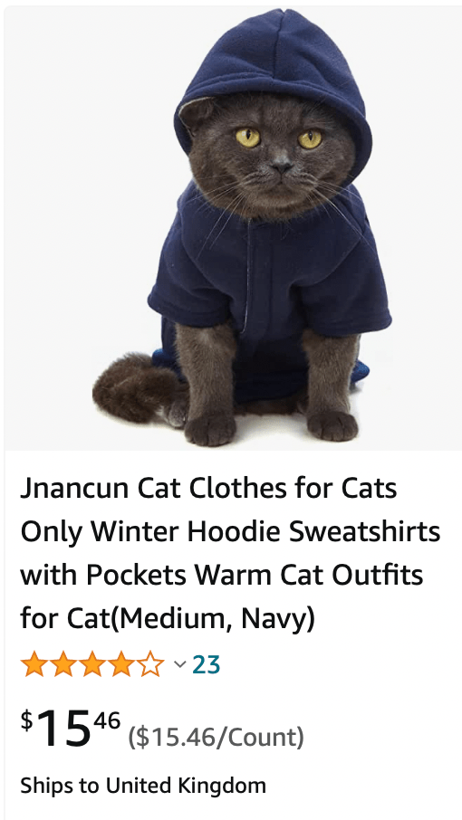 This cat hoodie costs $15.46. この猫パーカーは15.46ドルです。