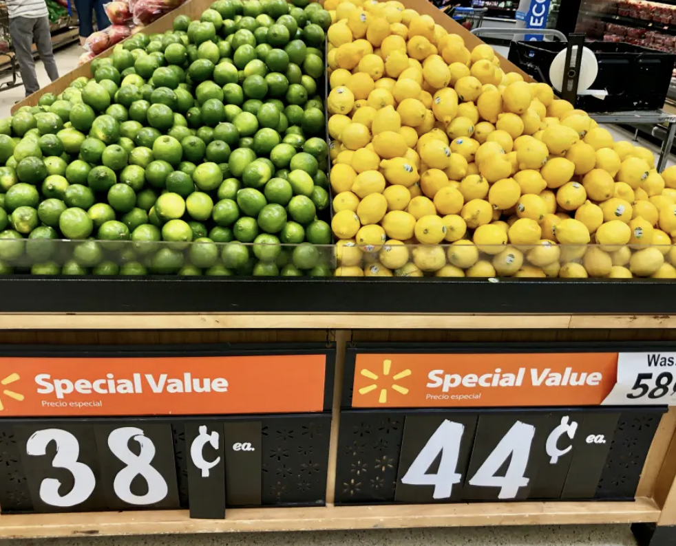 The limes are 38¢ (38 cents)、the lemons are 44¢ (44 cents)。