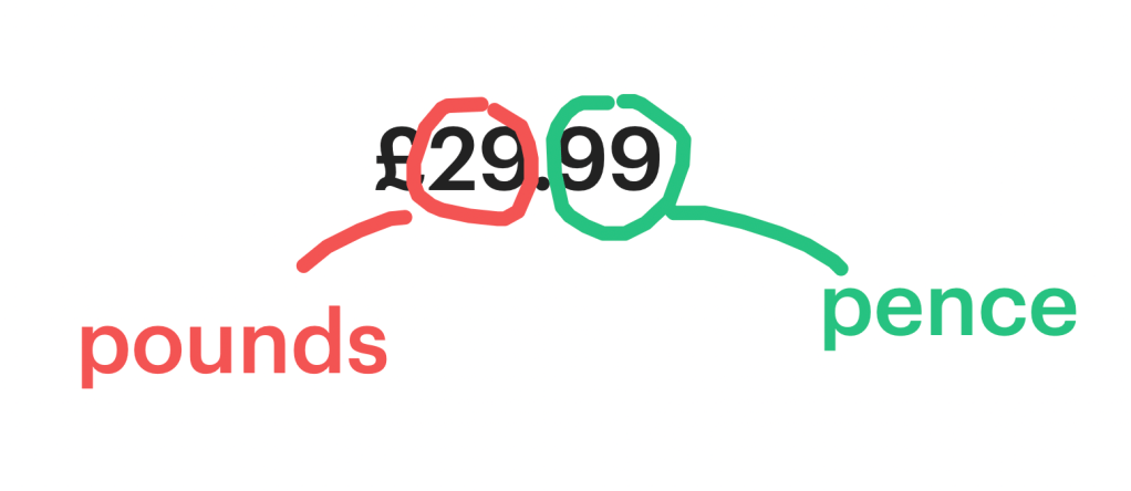 The number before the “ . ” is the pounds, and the number after the “ . ” is the pence.