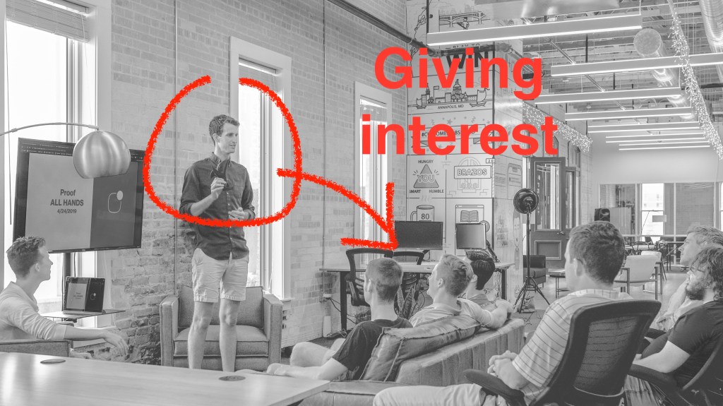 画像では、話し手が話しているのですから、明らかに行動を起こしているのは話し手です。彼は「interest」を創造し、与えているのです。