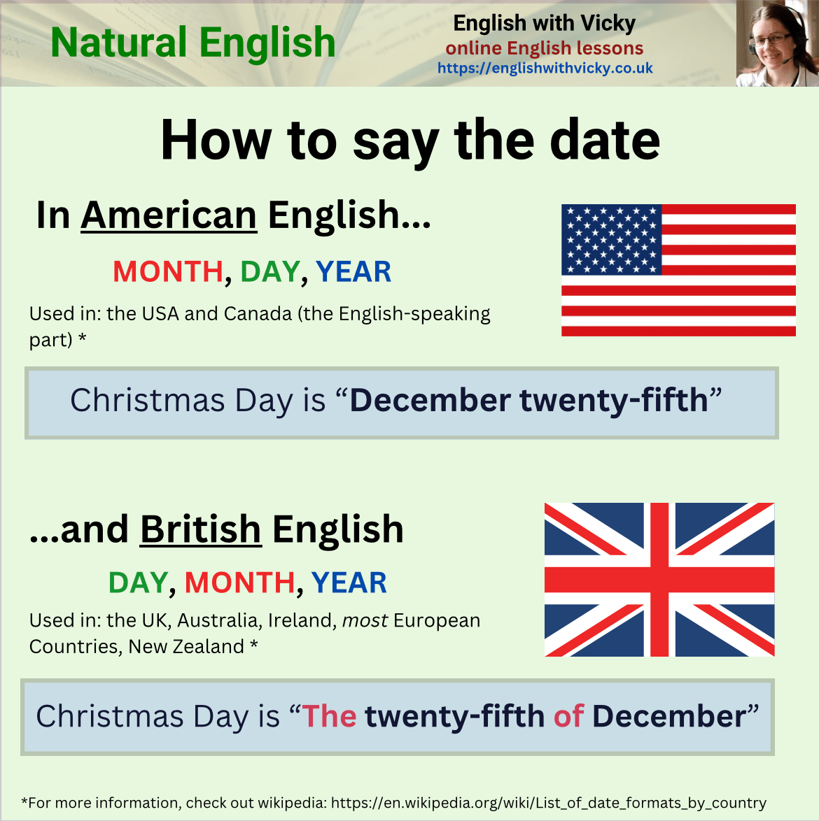 Natural English: Saying the date in British English and American English Posted byVickyJanuary 19, 2025Posted inNatural EnglishTags:Business English, English, 英語, 英語のレッスン, 英語勉強, 英語学習 Discover more from English with Vicky Subscribe to get the latest posts sent to your email. Type your email… Subscribe Related