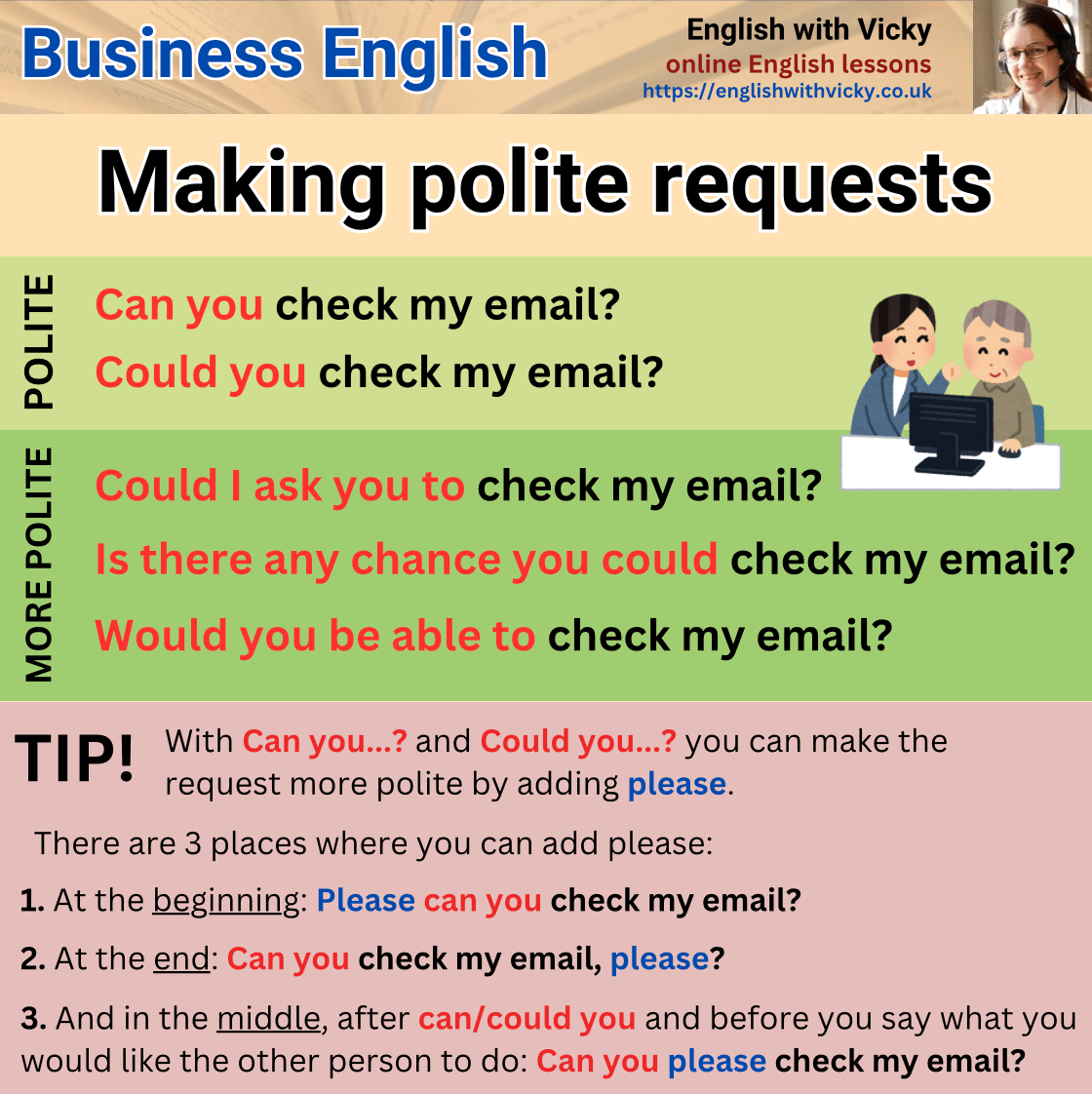 https://www.youtube.com/embed/VCn9HhwAiwA?si=Odew81ksBoSXqiT0 In my latest video I introduce some key phrases for making requests politely. ENGLISH BUSINESS BASICS COURSE Are you serious about progressing in your career? If so, English skills are a must. In my English Business Basics course you will learn the basics of English business conversation in 8 weeks. Topics include speaking onContinue reading "Making requests politely"