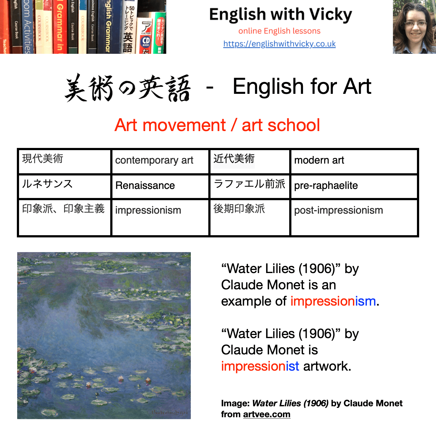 I’m bringing back my art vocabulary posts to promote my “English for Art” course. https://englishwithvicky.co.uk/bijutsunoeigo/ You can find more English art words here: https://englishwithvicky.co.uk/artwords/